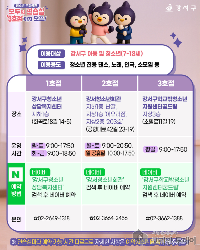 서울 강서구가 청소년의 문화 활동을 지원하는 무료 공간 ‘모두의 연습실’ 3호점을 오는 7월 14일 공식 개소한다. 이 공간은 춤, 노래, 연극, 소모임 등 다양한 활동이 가능한 청소년 전용 연습실로, 이용료는 전면 무료다. 모두의 연습실은 기존 1, 2호점에 이어 3번째로 마련된 청소년 문화공간이다.