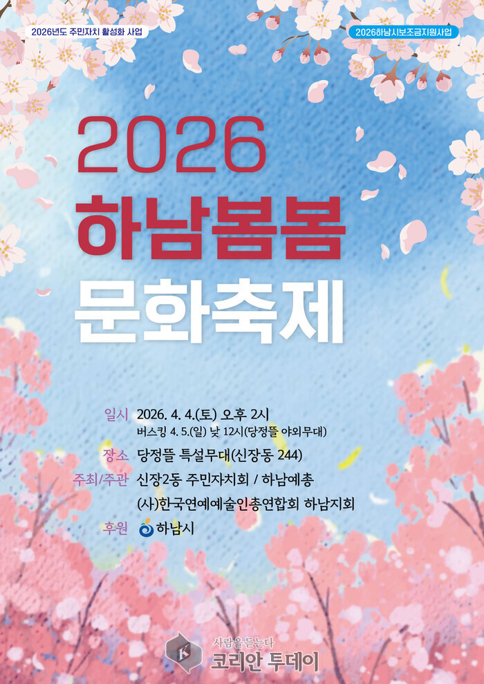 이번 축제는 신장2동 주민자치회와 (사)한국연예예술인총연합회 하남지회가 공동으로 주최·주관하고, 하남시가 후원하는 지역 대표 봄맞이 문화행사로 마련됐다. 따뜻한 봄기운 속에서 공연과 체험, 자연경관이 어우러지는 도심형 문화축제로 기대를 모으고 있다.